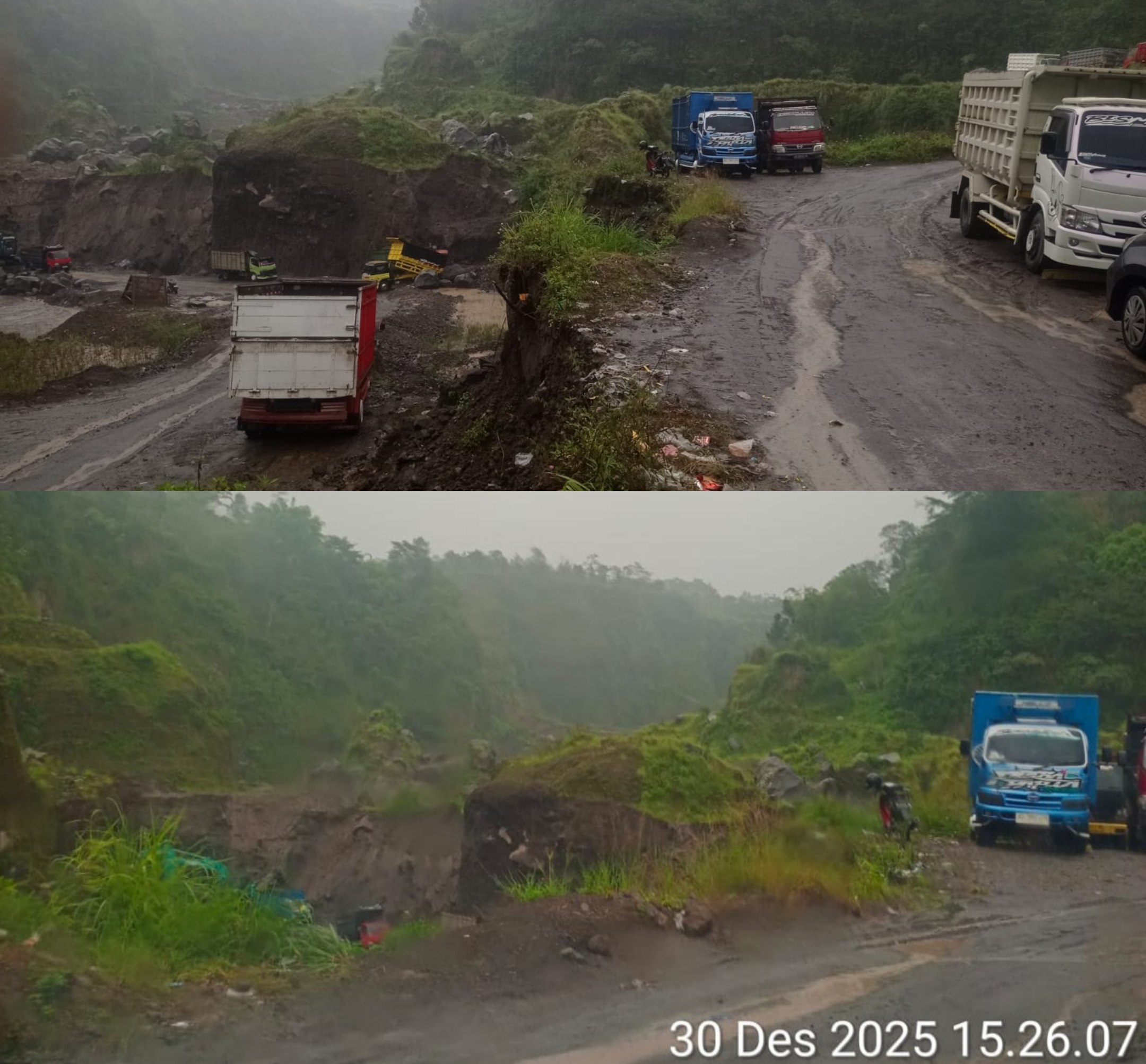 Pantauan di lapangan pada 30 Desember 2025 menunjukkan sejumlah dump truck bertonase besar keluar-masuk area berbukit dengan kondisi jalan tanah berlumpur.