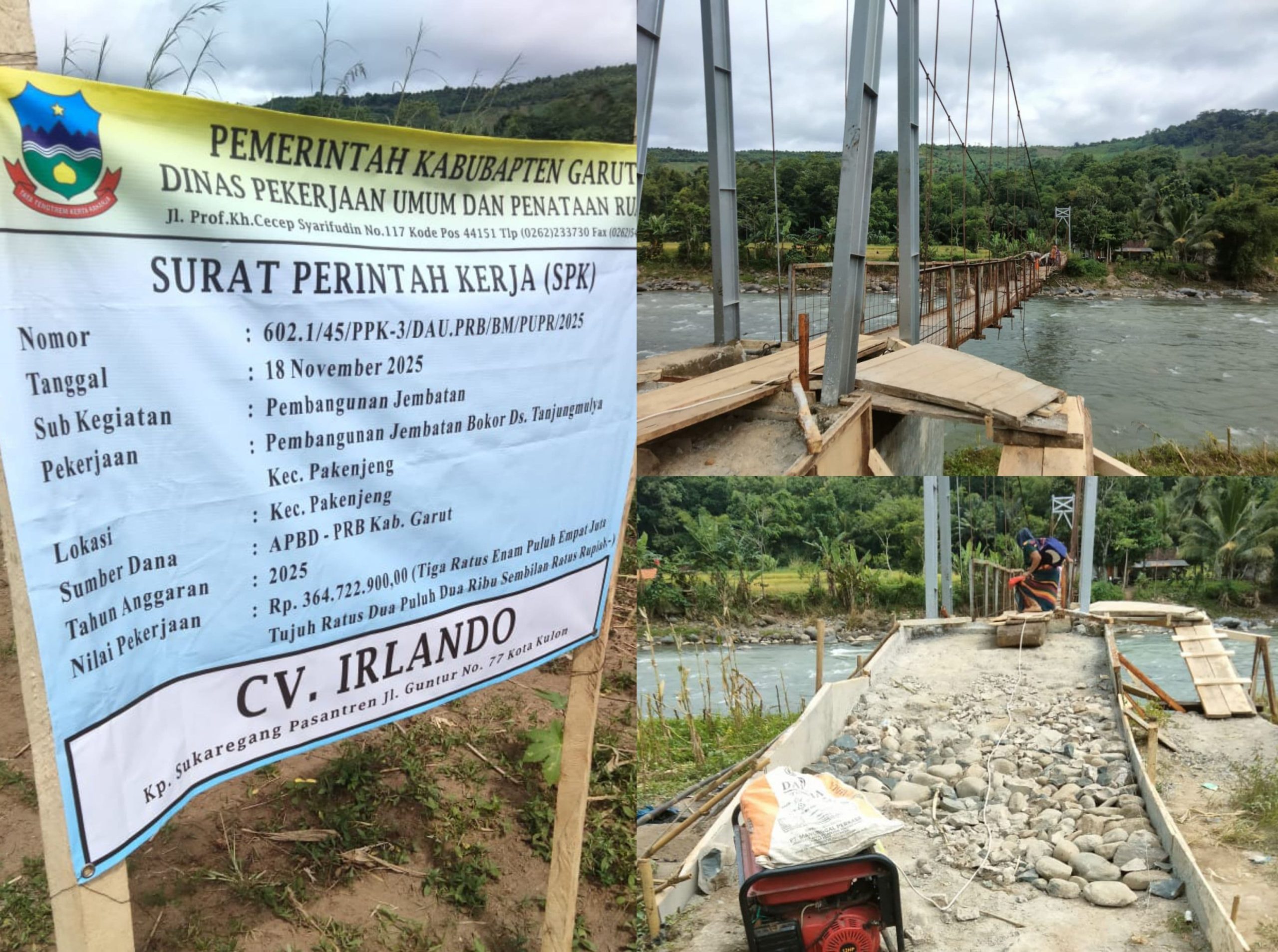 Garut, Cakrarajawali.com – Pembangunan Jembatan Bokor di Desa Tanjungmulya, Kecamatan Pakenjeng, Kabupaten Garut, menuai sorotan tajam dari masyarakat. Proyek yang dilaksanakan berdasarkan Surat Perintah Kerja (SPK) Dinas Pekerjaan Umum dan Penataan Ruang (PUPR) Kabupaten Garut Nomor 602.1/45/PPK-3/DAU.PRB/BM/PUPR/2025, tertanggal 18 November 2025, dengan nilai kontrak Rp364.722.900, diduga tidak dikerjakan sesuai spesifikasi teknis.” Kamis 4 Desember 2025