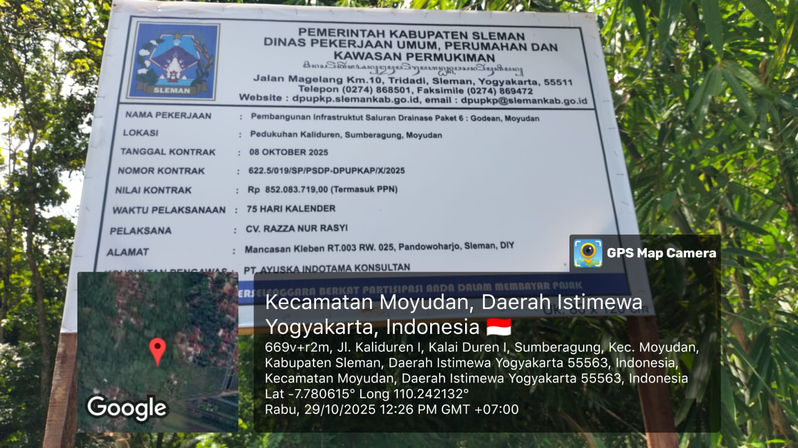 SLEMAN, WWW.CAKRARAJAWALI.COM — Jum’at, 14/11/2025. Pelaksanaan Proyek Pembangunan Infrastruktur Saluran Drainase Paket 6: Godean–Moyudan yang berlokasi di Padukuhan Kaliduren, Kalurahan Sumberagung, Kapanewon Moyudan, Kabupaten Sleman, DIY, kembali menjadi sorotan publik. Proyek milik Dinas Pekerjaan Umum, Perumahan dan Kawasan Permukiman (PUPKP) Sleman senilai Rp852.083.719,00, yang dikerjakan oleh CV Razza Nur Rasyi, diduga kuat tidak sesuai dengan spesifikasi teknis sebagaimana tertuang dalam kontrak.