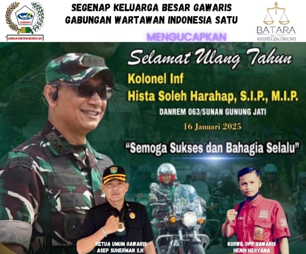 Garut – 16 Januari 2025,Segenap keluarga besar Gawaris (Gabungan Wartawan Indonesia Satu) dengan penuh rasa hormat dan kebanggaan menyampaikan ucapan selamat ulang tahun kepada Kolonel Inf Hista Soleh Harahap, S.I.P., M.I.P., Komandan Korem 063/Sunan Gunung Jati, yang merayakan hari bahagianya pada 16 Januari 2025.