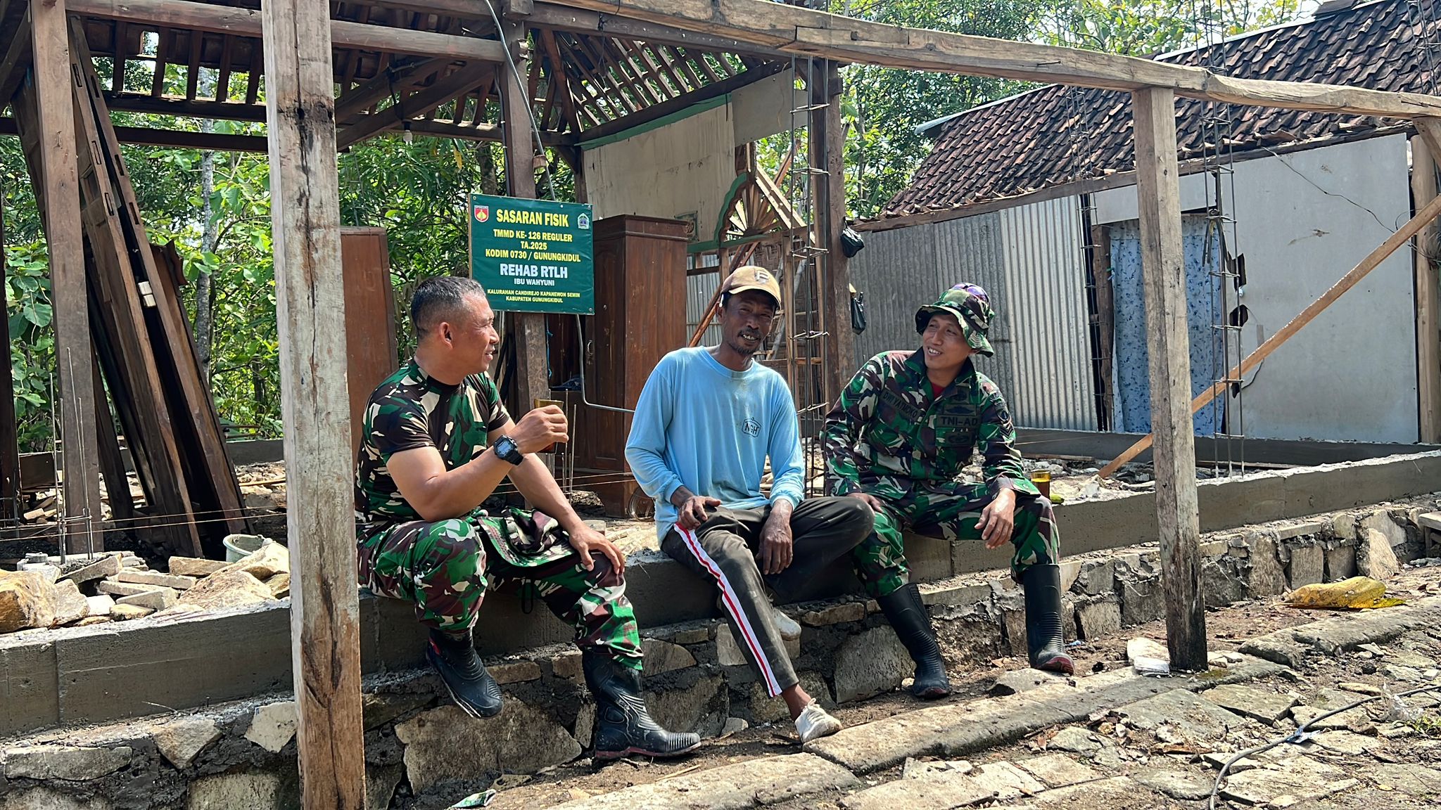 GUNUNGKIDUL, WWW.CAKRARAJAWALI.COM — Suasana kebersamaan dan keakraban tampak jelas dalam pelaksanaan TNI Manunggal Membangun Desa (TMMD) Reguler ke-126 Kodim 0730/Gunungkidul. Salah satu momen hangat terekam ketika personel TNI duduk santai menikmati teh bersama warga di sela-sela kegiatan rehab RTLH di Kalurahan Candirejo, Kapanewon Semin, Kabupaten Gunungkidul. Minggu (19/10/2025).