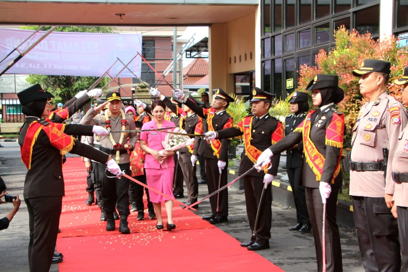 Acara diawali dengan pengalungan rangkaian bunga sebagai simbol penghormatan dan ketulusan keluarga besar Polres Gunungkidul menerima kehadiran pemimpin baru di Bumi Handayani. Langkah AKBP Damus Asa kemudian disambut oleh jajaran pedang pora yang terhunus megah, membentuk lorong kehormatan menuju gerbang utama.