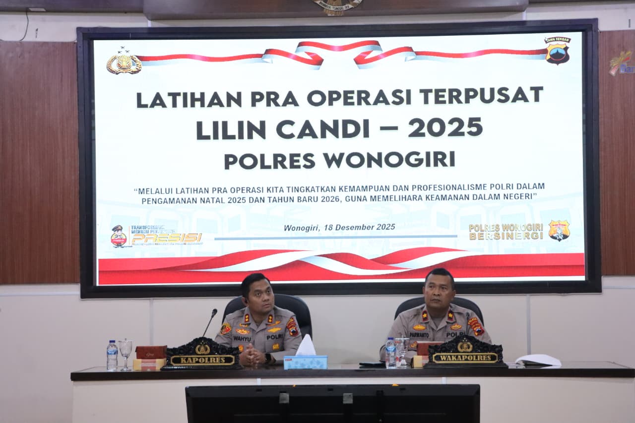 Wonogiri, Cakra Rajawali.com – Dalam rangka menyamakan persepsi serta meningkatkan profesionalisme personel dalam pengamanan Natal dan Tahun Baru, Polres Wonogiri menggelar Latihan Pra Operasi (Lat Pra Ops) Terpusat Lilin Candi 2025. Kegiatan tersebut dilaksanakan pada Kamis (17/12/2025) bertempat di Aula Polres Wonogiri.
