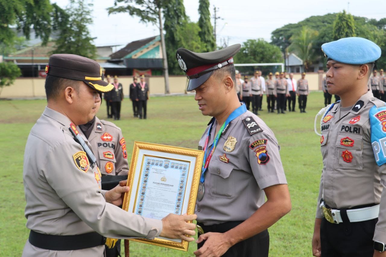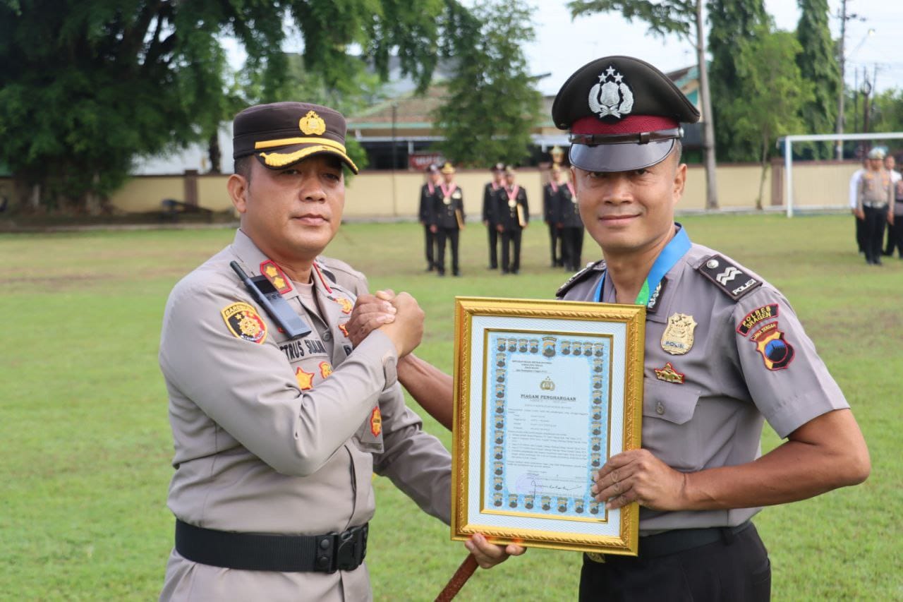 Atas pencapaian luar biasanya, Kapolres Sragen, AKBP Petrus Parningotan Silalahi, memberikan penghargaan berupa medali dan piagam kepada Aiptu Haryanto dalam sebuah seremoni upacara di Mapolres Sragen, Senin (20/1/2025).