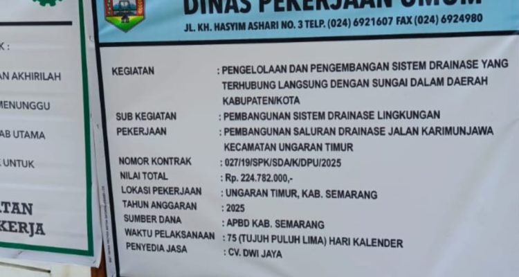 WWW.CAKRARAJAWALI.COM, KAB SEMARANG –Proyek pembangunan saluran drainase di Jalan Karimunjawa, Kecamatan Ungaran
